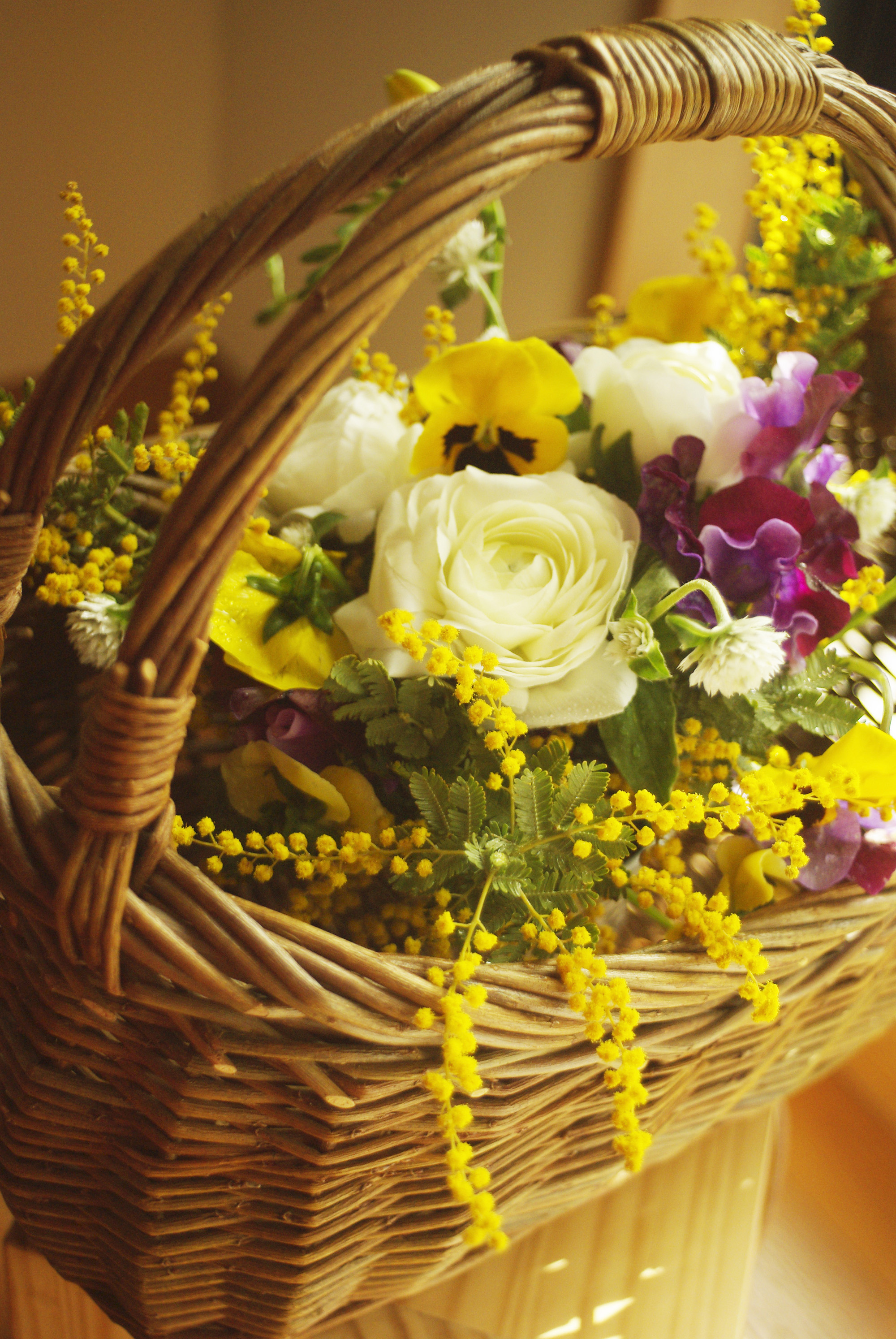 【作るもの】「花育 for women -幸せの黄色いアレンジメント-」(ミモザの花を使って、オトナのアレンジに仕上げます)画像はサンプルでありイメージです。当日の花材、材料は仕入れ状況により異なります。