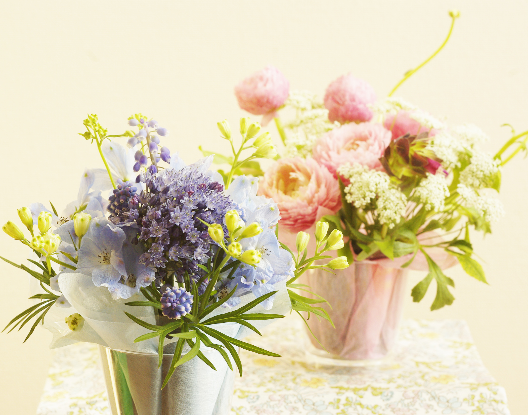 お好きな色をメインに使った春のお花のミニ・アレンジメント作りを